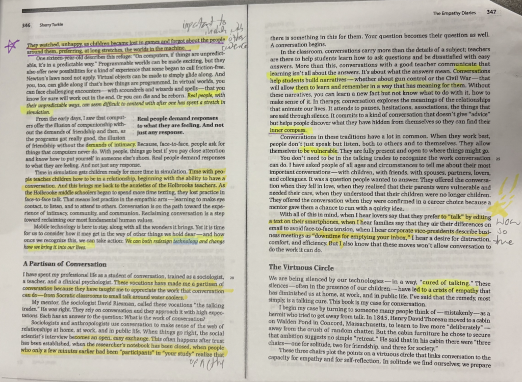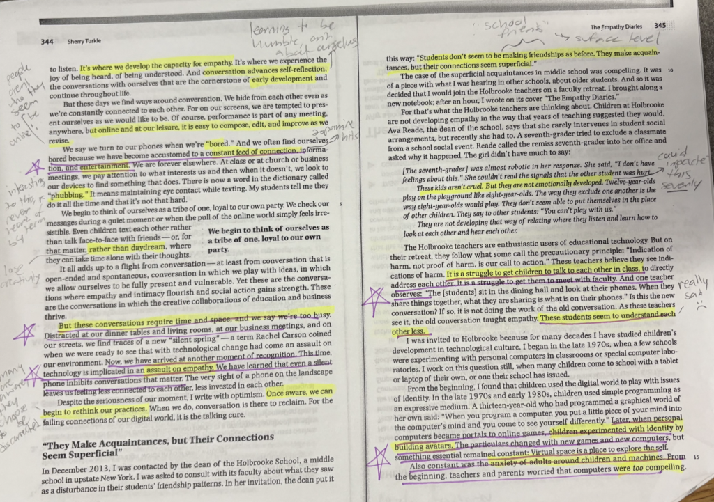 One of our very first assignments was to thoughtfully read and annotate the work by Sherry Turkle, The Empathy Diaries. Included in this page is an example of my annotation. My process was to annotate while I actively read. I was able to catch significant parts and give my own comments on it in real time. Being that it was the very first time annotating in the class, I felt that I highlighted everything, almost having a too critical approach. My process was to then turn back and underline with different markers what actually stood out and what I could use in my work as evidence. As for selecting evidence from my peers during project three, I had an interesting time figuring my way out. I originally felt set on using Peyton and James as evidence, but as I started writing and my thesis became more developed, I turned back to my peers’ work and used Kaia and Peyton instead. Below is an excerpt from my journal #25, which was used for my chosen work sample project three, and then a revised excerpt after going back.